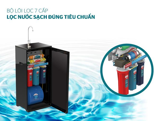 Máy được trang bị 7 lõi lọc tiêu chuẩn, mỗi lõi có 1 công năng riêng biệt nên có khả năng loại bỏ các tạp chất kim loại nặng, độc tố gây ung thư, bệnh đường tiêu hoá, viêm dây thần kinh, thoái hoá cột sống đau lưng,…