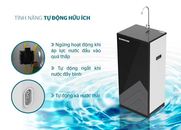 Máy được trang bị nhiều tính năng tự động hiện đại như: ngừng hoạt động khi áp lực nước đầu vào quá thấp, tự động ngắt khi nước đầy bình và tự động xả nước thải. Công suất lọc 15 lít/h và bình chứa nước 8 lít đáp ứng đầy đủ nhu cầu sử dụng nước sạch cho cả gia đình bạn.